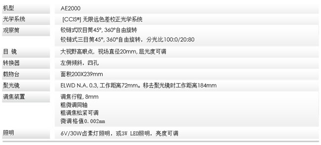 Motic推出全新的AE2000倒置生物顯微鏡,是組織檢測、活 細胞觀察的理想工具。無論在教學應用上,還是科研領域里, AE2000倒置生物顯微鏡都是一款可以完全滿足您需求的完美顯微鏡 Motic無限遠色差校正CCIS光學系統(tǒng)和高品質(zhì)的明場、相襯物鏡,成就了AE2000倒置生物顯微鏡卓越的圖像質(zhì)量。獨有的人機工程學觀察筒和智能感應模式,為日常應用帶來了更多的靈活性和多樣性。 技術參數(shù)